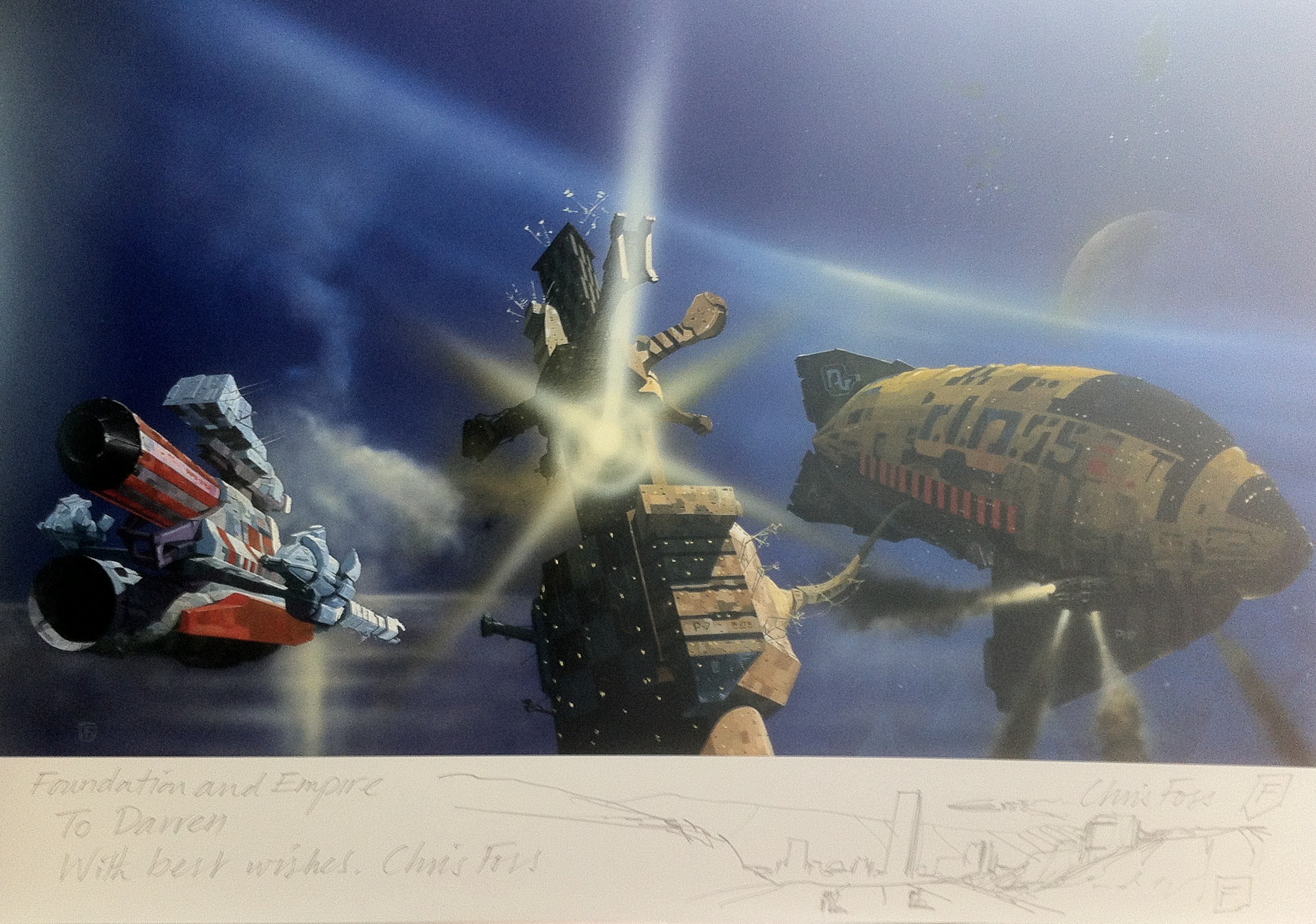 It’s now almost two years since Chris Foss was Artist Guest of Honour at London’s Worldcon, and where I was lucky enough to meet him and enjoy a brief conversation. And I do not care even a jot if it marks me out as an incredible nerd that, having purchased a print of his classic Foundation Trilogy triptych – upon which he added an original pencil sketch and a signature – I then bounced back to the Gollancz table, babbling semi-coherently and showing off my new purchase like a schoolboy.