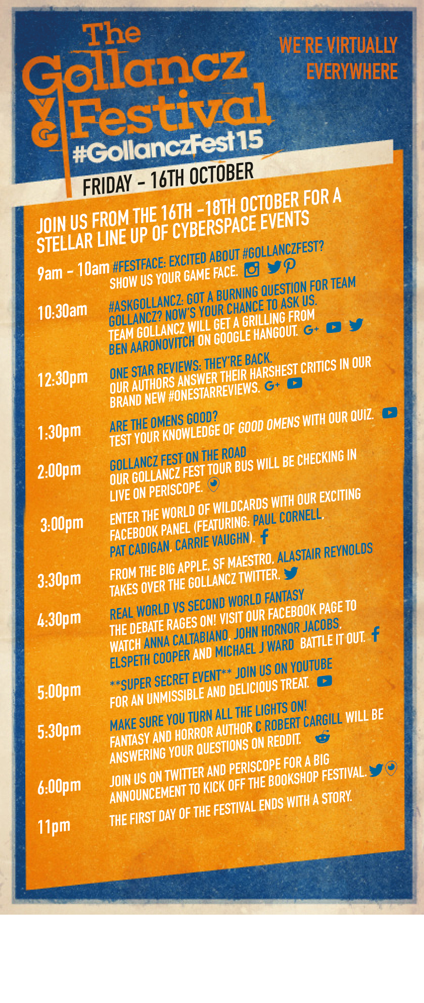 It’s #GollanczFest15 week! We are thrilled to reveal an action-packed programme of digital activities from Friday 16 October to Sunday 18 October at The Gollancz Festival 2015. Events will take place on nine social media platforms with the hashtag #GollanczFest15.