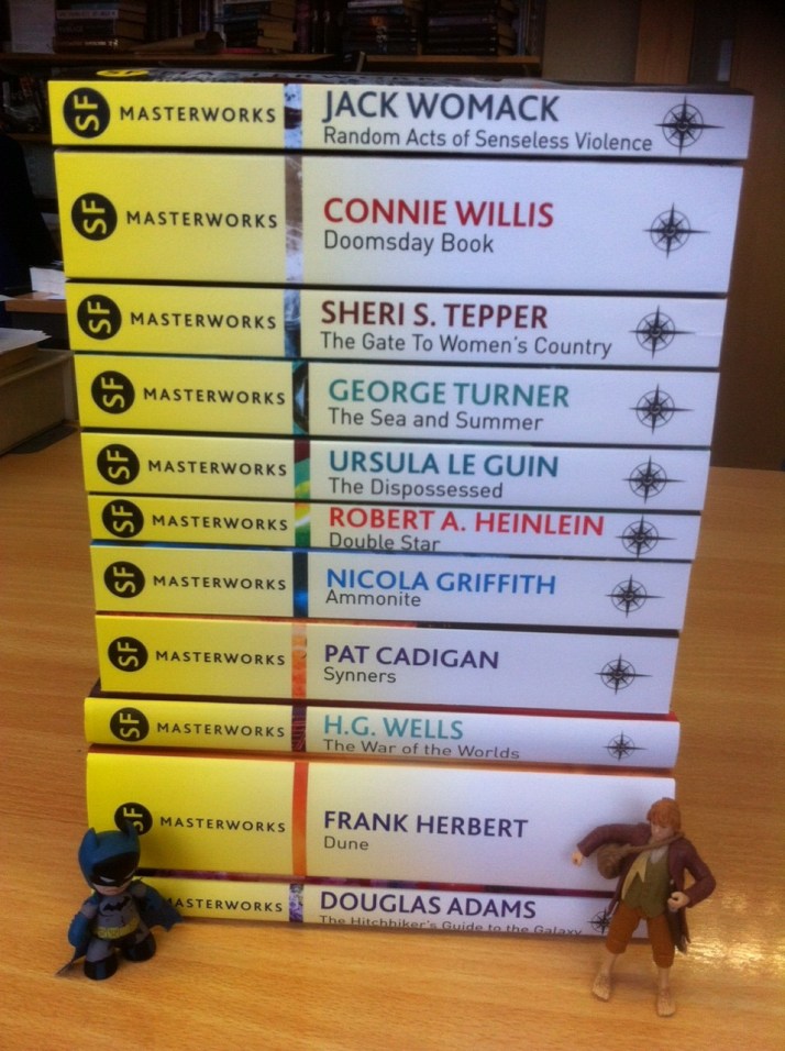 As you can see from the pile above – closely guarded by Middle Earth and Gotham City’s finest – we have two Arthur C. Clarke Award-winners (another prime number) in George Turner’s The Sea and Summer and Pat Cadigan’s Synners; three (yet another prime number) Nebula Award-winners in Connie Willis’s Doomsday Book, Ursula K. Le Guin’s The Dispossessed and Frank Herbert’s Dune; one (neither prime nor composite) James Tiptree Memorial Award-winner in Ammonite by Nicola Griffith; and four Hugo-winners (not a prime number – I think my ill-considered secondary theme may be falling apart, here) in Dune, Robert A. Heinlein’s Double Star, The Dispossessed and Doomsday Book. Also present – and no less awesome for having been criminally overlooked when the awards were being handed out are: Jack Womack’s Random Acts of Senseless Violence, Sheri S. Tepper’s The Gate to Women’s Country, Douglas Adams’ hilarious The Hitchhiker’s Guide to the Galaxy and The War of the Worlds by the father of science fiction, the great H. G. Wells.